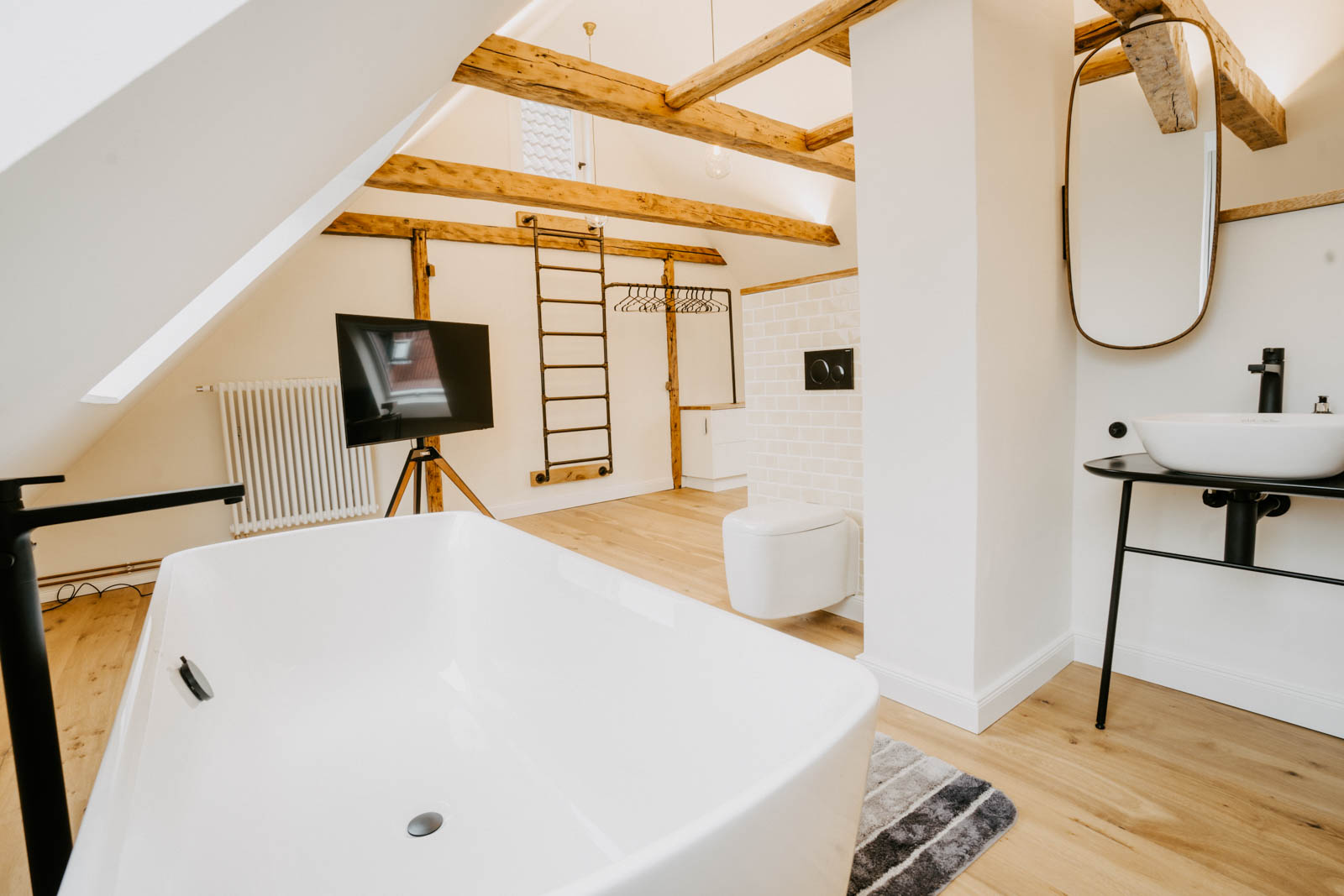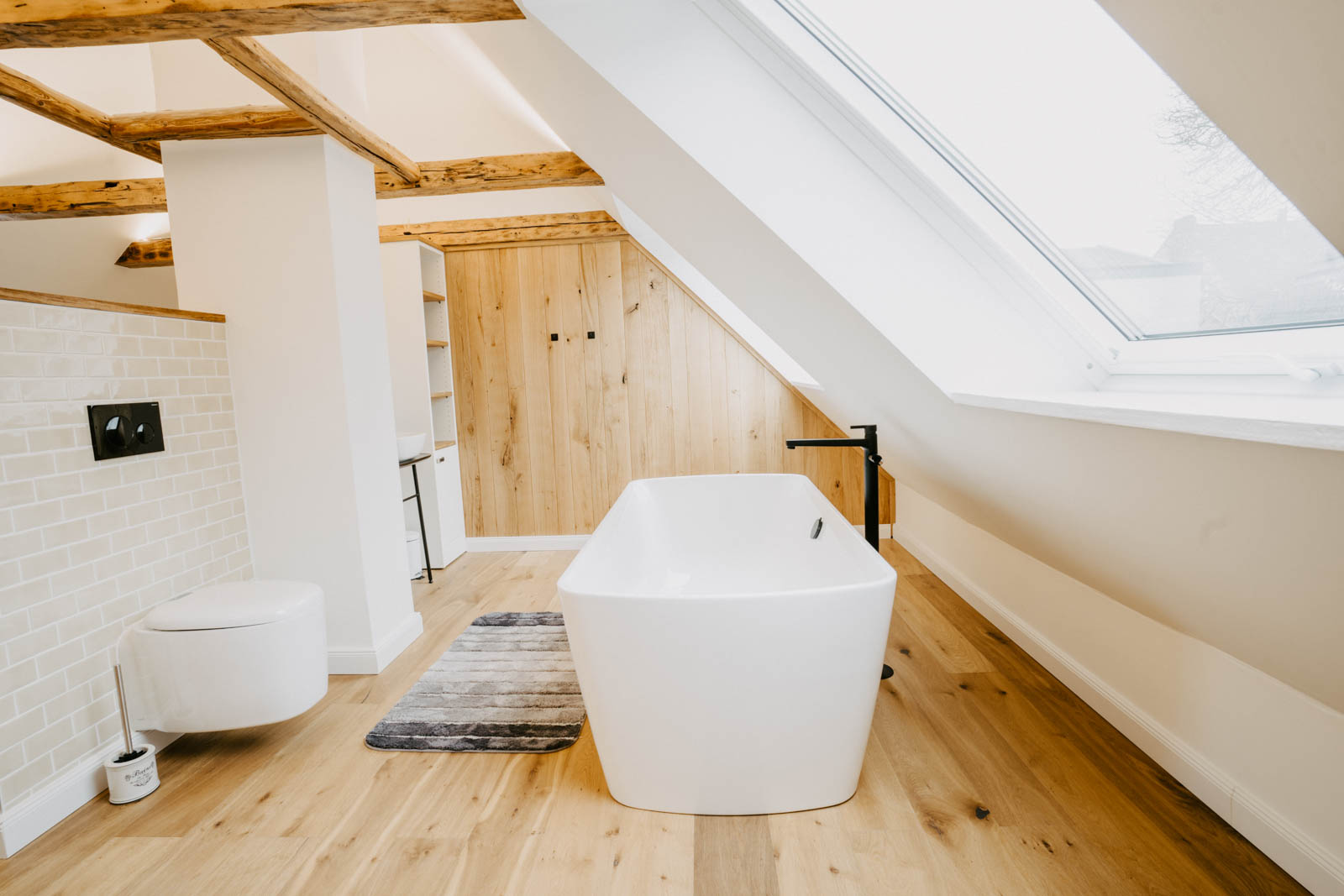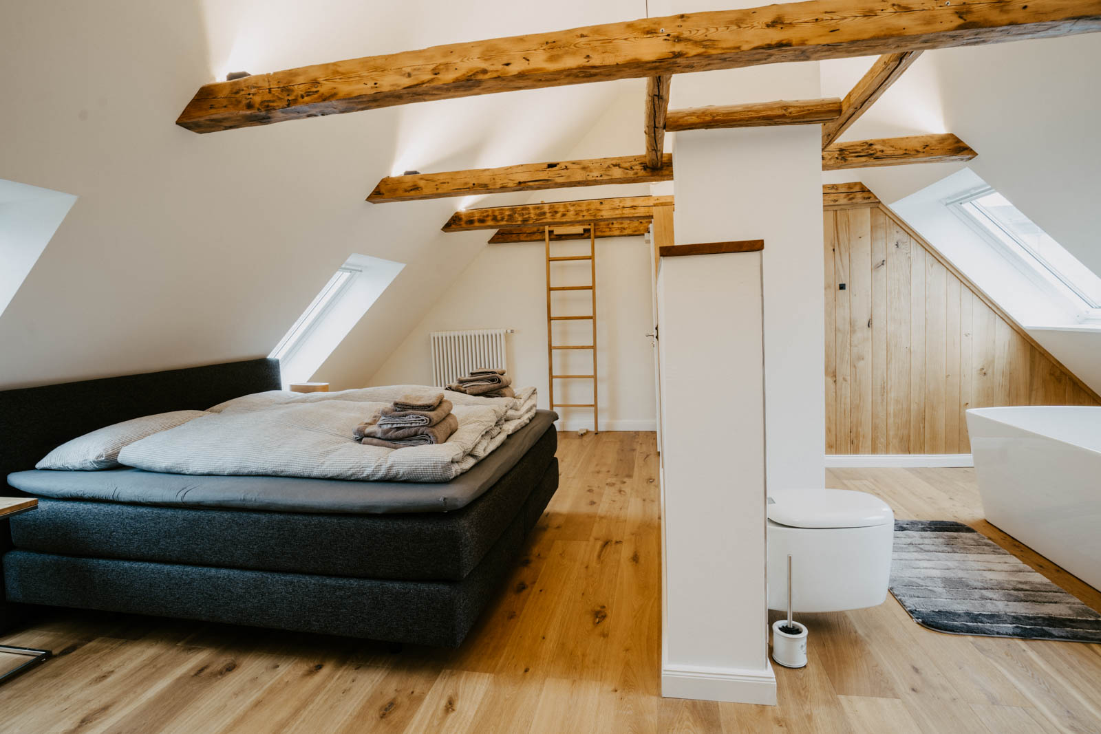 Toplage, Terrazoboden, Schalter und Steckdosen „Berker 1930 – schwarz“, Heizkörper „Zehnder Charleston“, umfangreiche Tischlereinbauten, Außeneinbausauna mit begrüntem Dach, Dachterrasse, freistehende Badewanne, exklusive Sanitärobjekte und Möbel.