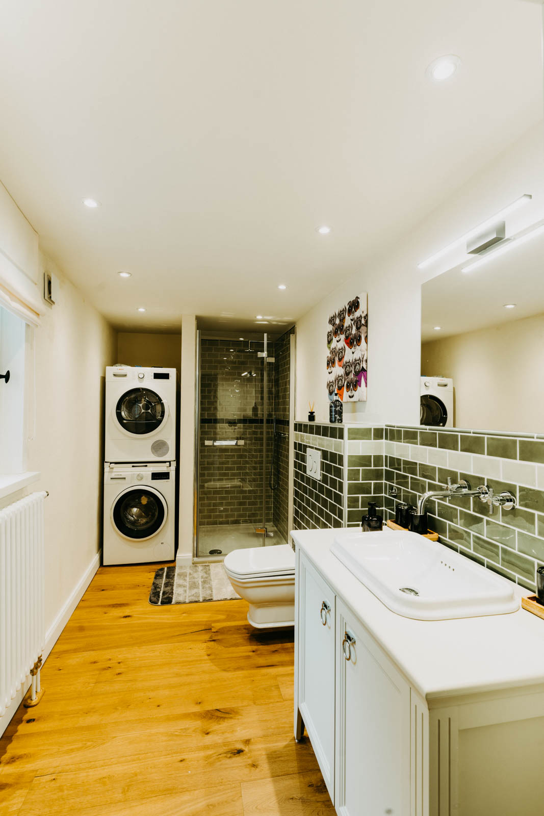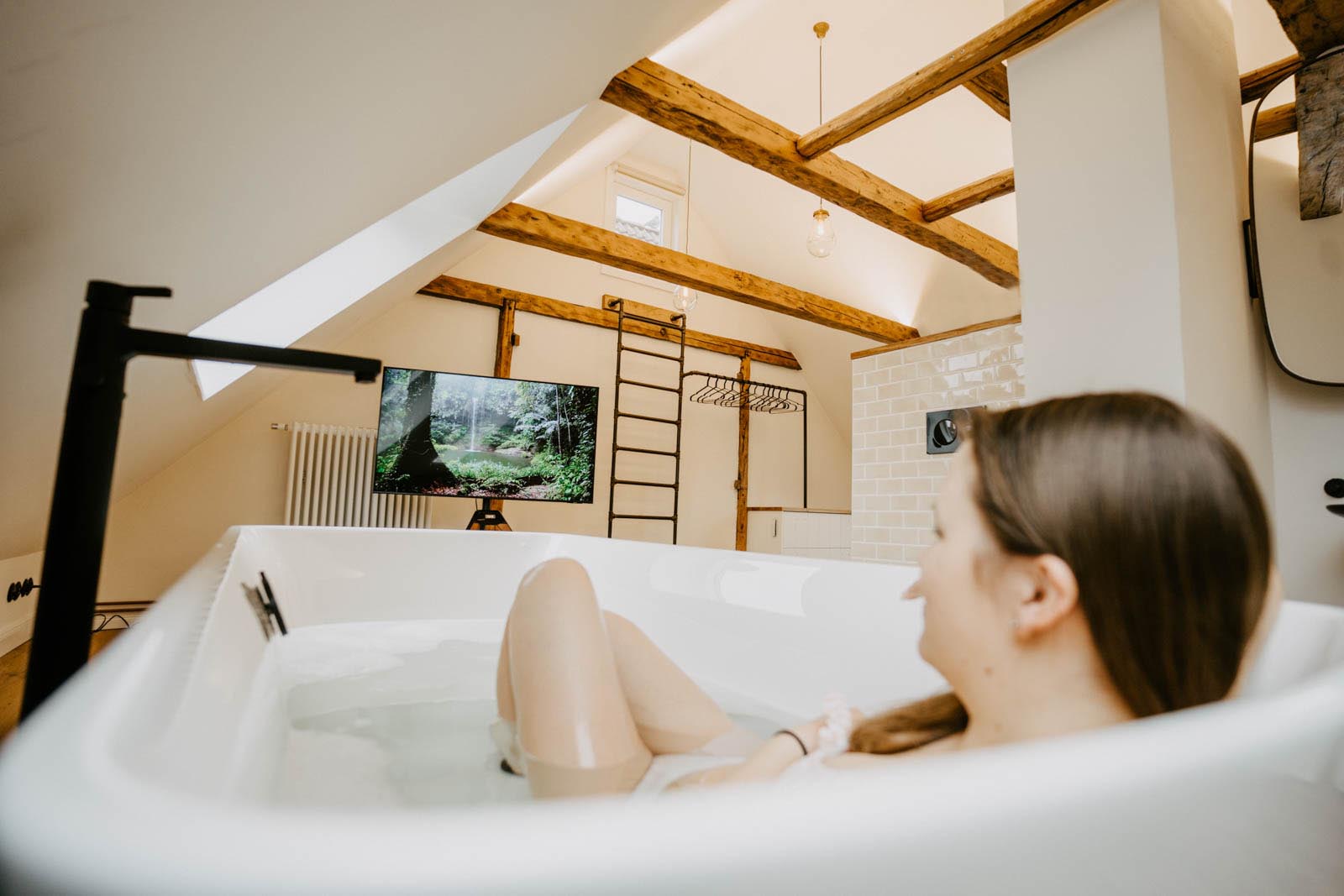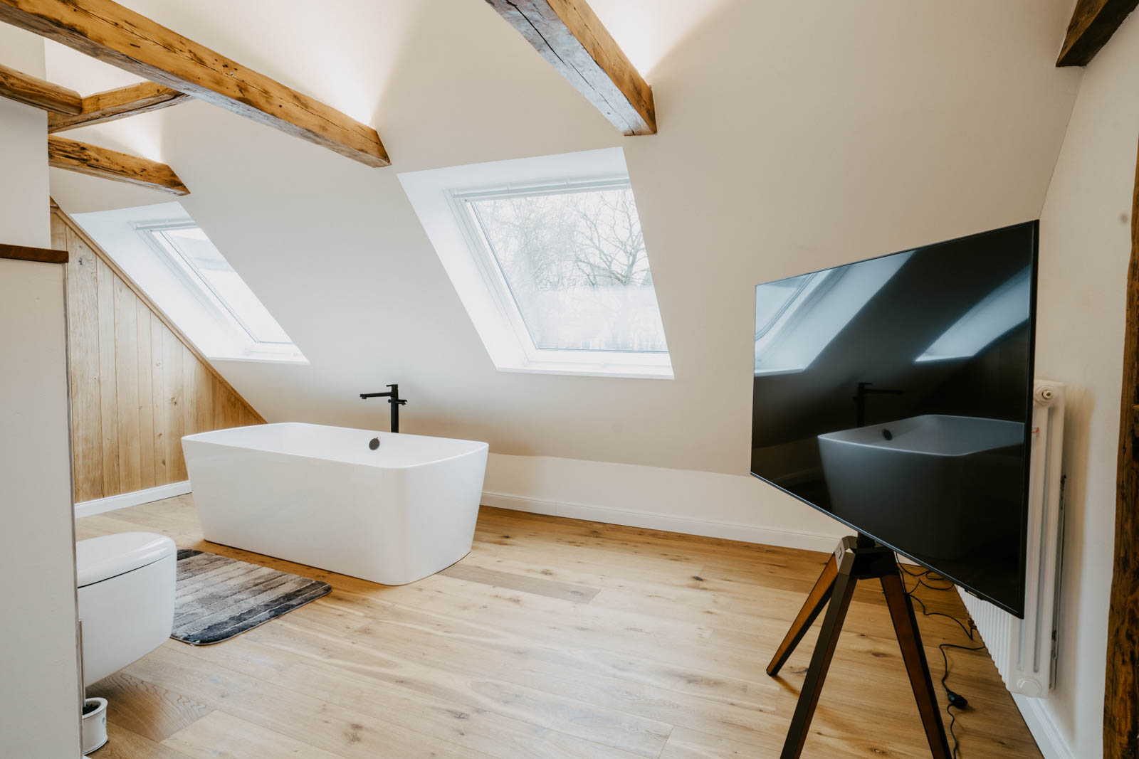 Toplage, Terrazoboden, Schalter und Steckdosen „Berker 1930 – schwarz“, Heizkörper „Zehnder Charleston“, umfangreiche Tischlereinbauten, Außeneinbausauna mit begrüntem Dach, Dachterrasse, freistehende Badewanne, exklusive Sanitärobjekte und Möbel.